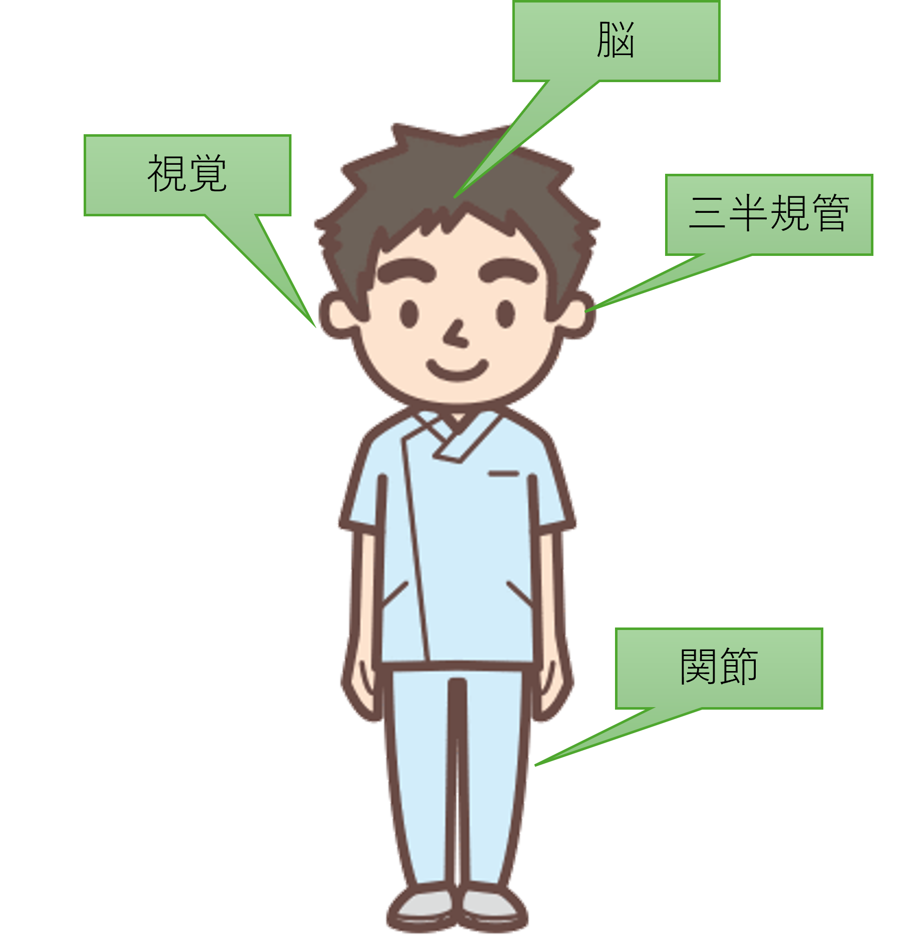 ヒトは重力や自分の位置を視覚、三半規管、関節・筋肉・皮膚知覚の3つの情報を脳で統合して判断しています。これらの経路のどこかに障害があるとめまいが起こります。めまいのみ(時に嘔気を伴う)が症状である場合は三半規管の障害が原因であることが多いです。