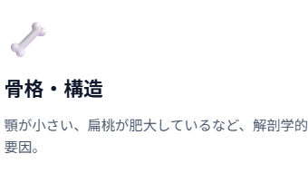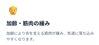 小児では、アデノイドや扁桃腺、成人では、肥満や加齢、下顎の小ささ、加齢に伴う筋肉のゆるみなどが原因で気道が狭くなり、空気の流れが妨げられます
