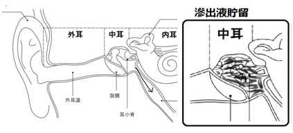 鼓膜の内側の中耳に液体がたまっている状態です。感染などによる慢性的な炎症が原因になります。 かぜ、鼻副鼻腔炎、急性中耳炎で、中耳に炎症がおこり、中耳の圧力が下がり、滲出液がたまるようになります。
