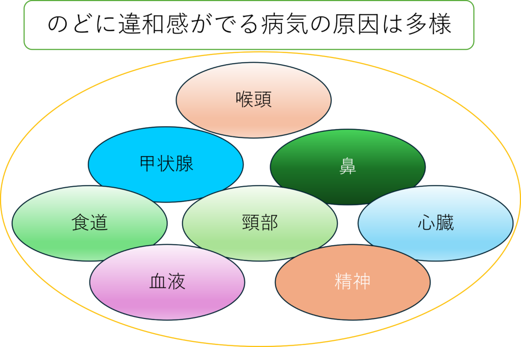 ・咽頭、喉頭だけではなく、鼻や食道などいろいろな部位の病気が考えられます。
